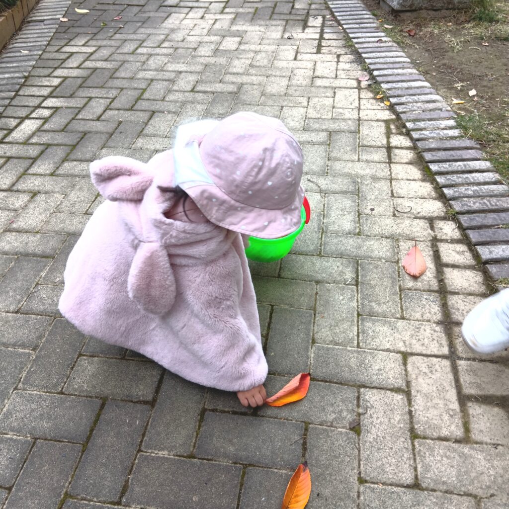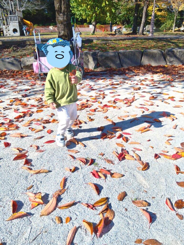木枯らしが吹いて、葉っぱもすっかり茶色や赤に色づいてきました。散歩に出掛けると落ち葉が沢山落ちていて子ども達と拾って集めたり、おままごとに使ったりしながら楽しく遊んでいます。
